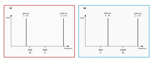 When the frequency of M is in the audible range, that is, 20 Hz or more, there is an effect on the timbre of the signal. The variations in amplitude become fast enough that the modulator generates a set of frequency sidebands. With two sine waves as carrier and modulator, RM will generate a frequency spectrum containing two sidebands, which are the sum and difference of the carrier and modulator frequencies. When this occurs, the actual carrier frequency is removed from the spectrum, leaving two harmonic sidebands (if the frequency of C and M are an integer ratio to one another) or two inharmonic sidebands (if the ratio is otherwise). For instance, if the carrier is 900 Hz and the modulator is 500 Hz, we will get two sidebands; one at 400 Hz (900 - 500) and one at 1400 Hz (900 + 500).