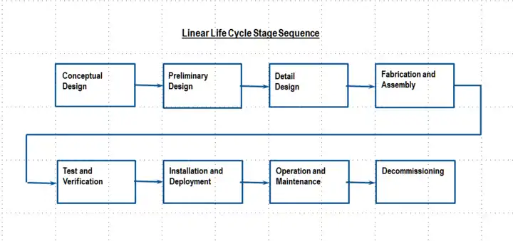 Complex systems evolve through a Life Cycle much the way living things do, from conception to disposal. The life cycle is divided into a number of stages where different tasks are performed (Figure 1.5-3). The design stages (the first three boxes in the figure) can be organized in different ways depending on the nature of the system. These include linear, parallel, spiral, or closed loop sequences, or some mixture of these. The illustration shows a typical linear sequence. A spiral process repeats stages in increasing detail, while a closed loop repeats at the same level of detail. Beyond the design stages, the process is more typically linear from production, through test, installation, operation, and retirement.