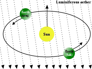 The speed at which the earth goes round the sun, v = 30 km/s, and the speed of light is c = 300,000,000 m/s which gives α = 20.5 seconds of arc every six months. This amount of aberration is observed and this contradicts the aether drag hypothesis.