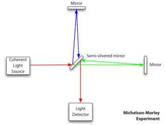 Michelson, though, had already seen a solution to this problem. His design, later known as an interferometer, sent a single source of white light through a half-silvered mirror that was used to split it into two beams travelling at right angles to one another. After leaving the splitter, the beams travelled out to the ends of long arms where they were reflected back into the middle on small mirrors. They then recombined on the far side of the splitter in an eyepiece, producing a pattern of constructive and destructive interference based on the length of the arms. Any slight change in the amount of time the beams spent in transit would then be observed as a shift in the positions of the interference fringes. If the aether were stationary relative to the sun, then the Earth's motion would produce a shift of about 0.04 fringes.