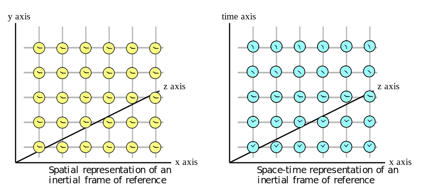 "An inertial reference frame is a (conceptual) three-dimensional latticework of measuring rods and clocks with the following properties: (i ) The latticework moves freely through spacetime (i.e., no forces act on it), and is attached to gyroscopes so it does not rotate with respect to distant, celestial objects. (ii ) The measuring rods form an orthogonal lattice and the length intervals marked on them are uniform when compared to, e.g., the wavelength of light emitted by some standard type of atom or molecule; and therefore the rods form an orthonormal, Cartesian coordinate system with the coordinate x measured along one axis, y along another, and z along the third. (iii ) The clocks are densely packed throughout the latticework so that, ideally, there is a separate clock at every lattice point. (iv ) The clocks tick uniformly when compared, e.g., to the period of the light emitted by some standard type of atom or molecule; i.e., they are ideal clocks. (v) The clocks are synchronized by the Einstein synchronization process: If a pulse of light, emitted by one of the clocks, bounces off a mirror attached to another and then returns, the time of bounce as measured by the clock that does the bouncing is the average of the times of emission and reception as measured by the emitting and receiving clock: .¹