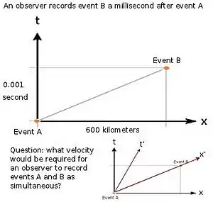 - An observer records an event A next to herself then an event B a millisecond later and 600 kilometres away. How fast would another observer need to travel in the direction of event B to record it as simultaneous with event A?