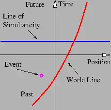 In order to gain an understanding of both Galilean and Special Relativity it is important to begin thinking of space and time as being different dimensions of a four-dimensional vector space called spacetime. Actually, since we can't visualize four dimensions very well, it is easiest to start with only one space dimension and the time dimension. The figure shows a graph with time plotted on the vertical axis and the one space dimension plotted on the horizontal axis. An event is something that occurs at a particular time and a particular point in space. ("Julius X. wrecks his car in Lemitar, NM on 21 June at 6:17 PM.") A world line is a plot of the position of some object as a function of time (more properly, the time of the object as a function of position) on a spacetime diagram. Thus, a world line is really a line in spacetime, while an event is a point in spacetime. A horizontal line parallel to the position axis (x-axis) is a line of simultaneity; in Galilean Relativity all events on this line occur simultaneously for all observers. It will be seen that the line of simultaneity differs between Galilean and Special Relativity; in Special Relativity the line of simultaneity depends on the state of motion of the observer.