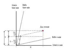 Bill and John are moving at a relative velocity, v, and synchronise clocks when they pass each other. Both Bill and John observe an event along Bill's direction of motion. What times will Bill and John assign to the event? It was shown above that the relativistic phase was given by: . This means that Bill will observe an extra amount of time elapsing on John's time axis due to the position of the event. Taking phase into account and using the time dilation equation Bill is going to observe that the amount of time his own clocks measure can be compared with John's clocks using: