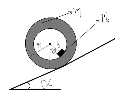 - A uniform ring of mass and radius carries an eccentric mass at a radius and is in equilibrium position on an incline, which makes an angle with the horizontal. If the contacting surfaces are rough enough to prevent slipping, write the expression for the angle which defines the equilibrium position.