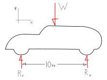 The picture to the right shows the forces acting on a parked car. If the weight of the car acts exactly halfway between the two wheels and the weight is 1000 lbs how much force is exerted on the rear wheel? What about the front wheel?