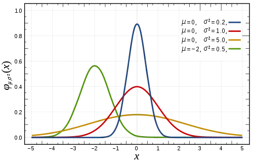 Normal distribution is without exception the most widely used distribution. It also goes under the name Gaussian distribution. It assumes that the observations are closely clustered around the mean, μ, and this amount is decaying quickly as we go farther away from the mean. The measure of spread is quantified by the variance, .