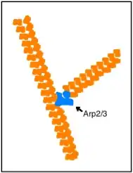 Actin is a protein complex that forms the majority of a cell’s cytoskeleton. The globular portions of action (G-actin) are bound together in the long, thin microfilaments of F-actin. The F-actin microfilaments are double-stranded in a double helix formation. It is the actin-related protein (Arp2/3) complex that facilitates a process called nucleation, which is the formation of a new actin microfilament branch. The daughter filament stems from the parent filament in a y-shape at an expected angle of about 70 degrees. Actin has been observed to have many different functions like muscle contraction, maintaining cell shape, mobility of the cell, division of the cell and also in cell signaling. The function of interest here is the role of actin in the many steps of endocytosis.