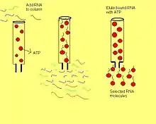 1. Initially, a randomized RNA pool containing of any variety molecules is present in a given population inserted into an ATP affinity column.