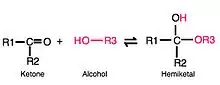 A Hemiketal is formed when a ketone react with an alcohol. The ‘-OR’ in alcohol attacks the oxygen in ketone, thus breaking the ‘C-O’ double bond. And the ‘H’ in alcohol bonds to the O.