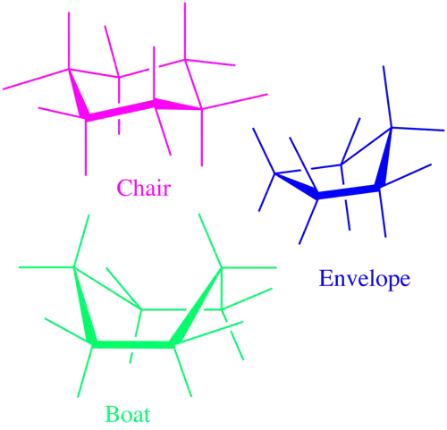 Hexoses and pentoses that have converted into pyranoses or furanoses take on either chair, boat, or envelope conformations due to the tetrahedral geometry of their carbons. Pyranose rings can form either chair or boat conformational isomers (conformers) while furanose rings take on the envelope (also called half-boat) conformation. Substituents on the carbons in the monosaccharides are now either in axial or equatorial positions. The favored conformational isomer will be that which is the least sterically hindered, often containing the majority of its bulkier substituents in equatorial positions, since substituents in axial positions on the same side of the ring create steric hindrance. The chair conformation of pyranose rings can also undergo a ring flip, which switches the orientation of substituents from axial to equatorial and vice-versa, to produce an additional conformational isomer. Chair conformation of six-membered rings is most favorable as it reduces steric interference between two carbon substituents. Boat and Envelope conformations do not exist, but are theorized to act as an intermediate structure existing briefly between a ring flip transition in which axial substituents become equatorial and vice versa.