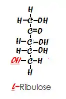 D and L enantiomers refer to the configurational stereochemistry of the molecule. L isomers have the hydroxy group attached to the left side of the asymmetric carbon furthest from the carbonyl, while D isomers have the hydroxy group on the right side. Many naturally occurring sugars are D isomers, although exceptions include arabinose and rhamnose. This system of nomenclature is NOT necessarily the same as optical rotation (D and L are not the same as d and l). In other words, D and L configurations do not fully designate absolute stereochemistry, rather they are determined on the basis of the anomeric carbon center and how its orientation compares to glyceraldehyde, the most basic and simple chiral sugar molecule. It is mostly in aldoses and is not present in ketoses.