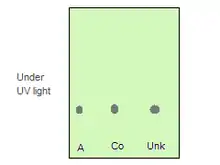 2. If there is only one dark spot for the unknown and it is uncertain whether the spot for compound A is at the same level as the spot for the unknown, one can co-spot both compounds on the TLC plate for a quick check. Co-spot means to spot compound A on one area of the TLC plate and spot the unknown on the same area as the spot of compound A. If there is only one dark spot under the UV light for the co-spotting lane, the identity of unknown is A.