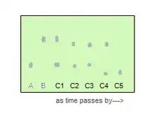 Two spots on C1 align with A and B suggests just a mixture of A+B, not a new product. C2 and C3 still have one spot aligning with reactant A, but C4 has both spots that do not match with either reactant, where C5 only has one dark spot. There are two possible interpretations: