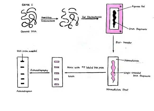Method Summary : First, a mixture of restriction fragments is separated by electrophoresis through an agarose gel, denatured to form a single stranded DNA, and then transferred to a nitrocellulose sheet. The positions of the DNA fragments in the gel are preserved on the nitrocellulose sheet because it is directly blotted onto the sheet from the agarose gel. Next, the fragments are exposed to a 32P-labeled single stranded DNA probe which hybridizes with a restriction fragment having a complementary sequence. After hybridization, an autoradiography reveals the position of the restriction-fragment-probe duplex and ultimately the identity of the DNA fragment.