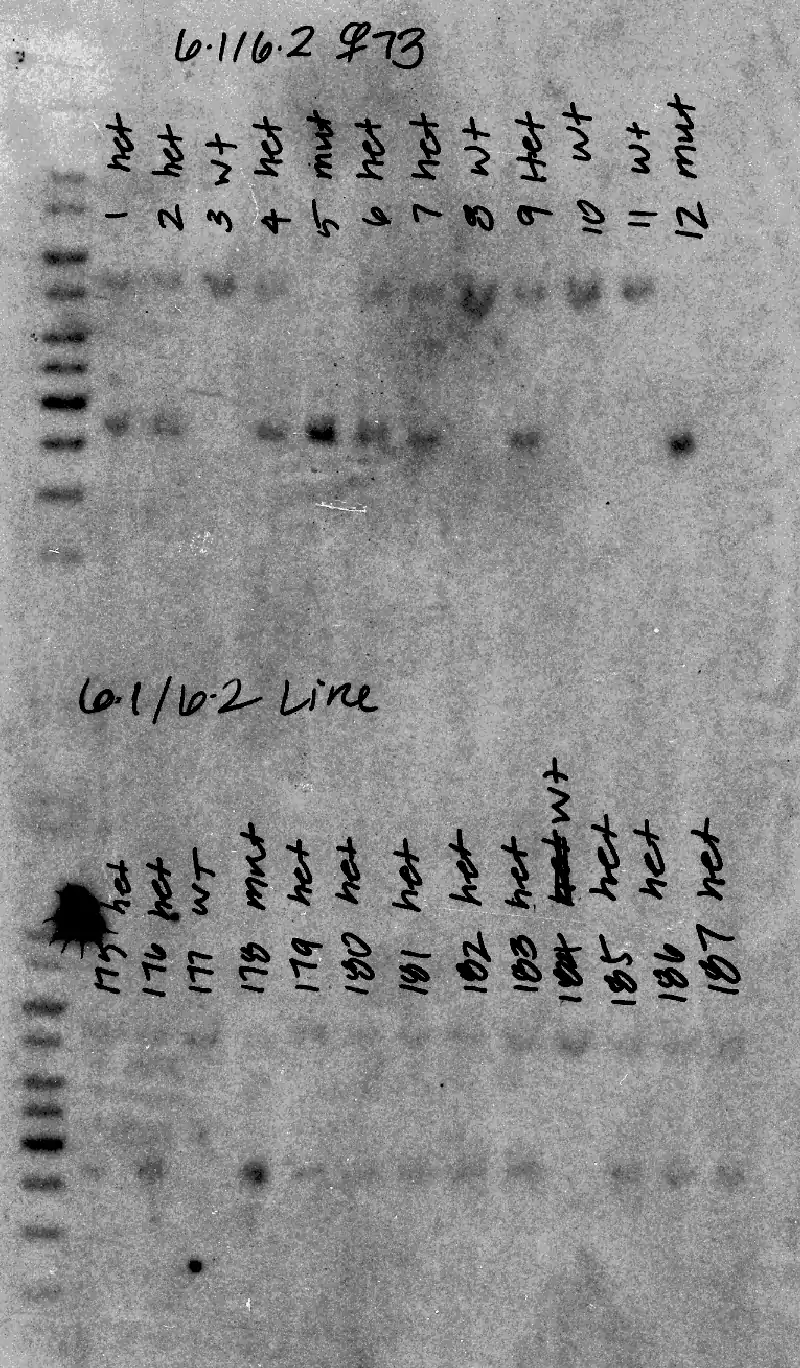 As mentioned above, Southern blots utilize DNA probes to detect the presence of complementary, target DNA sequences. In this case, the Southern blot was run using mouse DNA from mice which were breed in the mouse colony. Southern blotting is a way to track the genetic make up of each new litter of mice and the genotypes of old mice. In the picture, it can be seen that heterozygous, mutant, and wild-type mice are all distinguished by the types of bands that show up in their segment of the blot. Heterozygous mice have sequences for both the top and bottom bands whereas mutants only have the bottom band. Wild-type mice have only the top band of DNA detected by the probe. On the left side is a DNA standard, which is run to show the progress of different sizes of DNA. The labeling at the top shows the mouse line and female number for the mouse that gave birth to the litter whose DNA is being blotted.