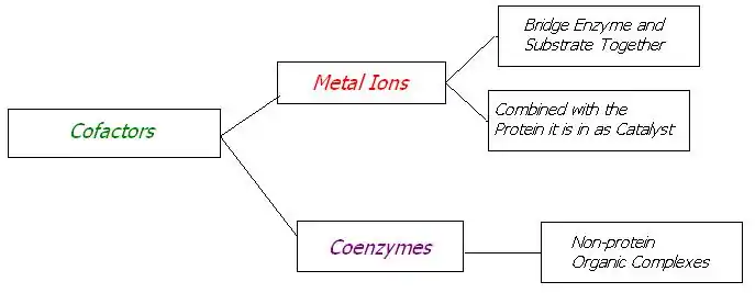 Cofactors, mostly metal ions or coenzyme, are inorganic and organic chemicals that function in reactions of enzymes. Coenzymes are organic molecules that are nonproteins and mostly derivatives of vitamins soluble in water by phosphorylation; they bind apoenzyme protein molecule to produce active holoenzyme.