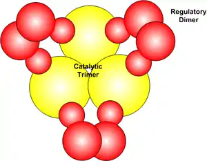 ATCase is made of six regulatory subunits and six catalytic subunits. The 3 regulatory subunits (r) are dimers made of 2 chains of 17 kd each. The smaller of the two, the regulatory subunit can bind to CTP and thus shows no catalytic activity. The 2 catalytic subunits (c) are trimers consisting of 3 chains, each 34 kd. The catalytic subunit is unresponsive to CTP thus does not follow a sigmoidal behavior.