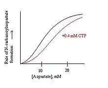 Cytidine triphosphate (CTP), the end product of ATCase acts as an allosteric regulator. Carbamoyl phosphate and aspartate condense into N-carbamoylaspartate intermediate which then forms CTP. CTP binds to the r chain of the regulatory subunit not in contact with the c chains. The binding of CTP stabilizes the T state and decreases substrate affinity. Even though the binding site at the regulatory subunit is distant from the catalytic subunit, the binding will result in quaternary structural changes which promotes the stabilization of the T-state and inhibition. Thus, it causes the sigmoidal curve to shift to the right. The reaction will occur fast at a low concentration of [CTP], but at higher concentrations, CTP will act as an inhibitor to ATCase by regulatory or allosteric sites, not active sites. This is an example of negative feedback, where the end result will terminate the starting reaction. The feedback inhibition of CTP on ATCase can be reversed by ATP.