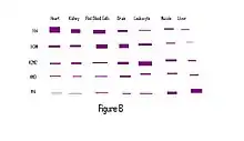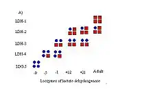 Isozymes in general can be used to meet the metabolic needs of different tissues and developmental stages. An example of an enzyme with different isozymes is lactate dehydrogenase (LDH). This enzyme is used to catalyze the synthesis of glucose in anaerobic metabolism of glucose. The isozymes of this enzyme are divided into two forms, the H isozyme and the M isozyme. The H isozyme is expressed more in the heart, whereas the M isozyme is expressed more frequently in the skeletal muscle. Both isozymes have two polypeptide chains, and each isozyme share 75% of the amino acid sequence for the chains. Both isozymes metabolize glucose, but the difference is that the H isozymes have a higher affinity for their substrates than the M isozyme does. Another difference is that the H isozyme functions better in aerobic environments such as the heart, whereas the M isozyme functions better in anaerobic environments such as the muscle, where strenuous activity may deplete the oxygen supplies. For example, when a rat heart is developing, the amount of H and M isozymes in the rat heart tissue begins to change because of the switch from an anaerobic environment to an aerobic one. This can be seen in figure A. This chart describes the rat heart's lactate dehydrogenase isozyme profile changes as the rat heart tissue develops. The H isozyme is shown as squares and the M isozyme is shown as circles. the negative numbers are the days before birth and the positive numbers are the days after birth. The amount of M isozymes decreases dramatically as the rat grows into the adult stage.