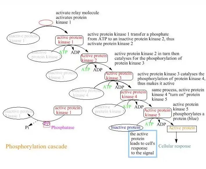 Phosphorylation is a covalent modification that controls the activity of enzymes and other proteins. Signals can be greatly amplified by this modification because one kinase has the potential to create an exponential chain effect on various target molecules. An example of this would be the sensitivity of human eyes in reaction to a photon. Protein kinase regulatory activations can be reversed by protein phosphatases, a hydrolysis reaction of connected phosphates. Cyclic AMP, an intercellular messenger, can activate protein kinase A. Cyclic AMP activates Protein Kinase A by altering the quaternary structure. The effects of cAMP in eukaryotic cells are due to activation of PKA by cAMP.The activation of that multifunctional kinase is accomplished by cAMP binding to the regulatory subunit of the enzyme, which frees the functional sites of protein kinase A. When a inhibitor is bound to a Protein kinase A, it binds between the domain of the enzyme in a cleft.