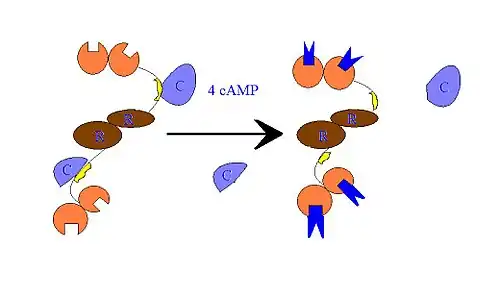 Regulation of PKA: PKA is activated when four molecules of cAMP bind to it; this dissociates the inhibited holoenzyme(R2C2) into a regulatory subunit (R2) and two catalytically active subunits (C).