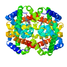 Hemoglobin (Haemoglobin in many varieties of English and often abbreviated to 'Hb') is a tetramer consisting of two dimers that bind to oxygen. Hemoglobin is the oxygen-transporting protein of red blood cells and is a globular protein with a quaternary structure. Hemoglobin consists of four polypeptide subunits; 2 alpha chains and two beta chains. Hemoglobin transports oxygen in the blood from the lungs to the rest of the body. The three-dimensional structure of hemoglobin was solved using X-ray crystallography in 1959 by Max Perutz. The structure of hemoglobin is very similar to the single polypeptide chain in myoglobin despite the fact that their amino acid sequences differ at 83% of the residues. This highlights a relatively common theme in protein structure: that very different primary sequences can specify very similar three-dimensional structures.