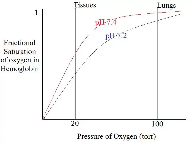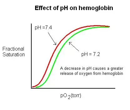The pH, or proton concentration of a given solution, is another allosteric regulator of hemoglobin. Interestingly enough, pH can act as both an allosteric activator and inhibitor, depending on the direction of pH change. As pH decreases, for example, the affinity of hemoglobin for oxygen decreases as well. This is due to the fact that protons help construct salt bridges in the T-state of hemoglobin. In general, the T-state of hemoglobin is favored by three amino acids that form two salt bridges; one of these salt bridges requires an added proton to form successfully. Thus, the higher the proton concentration (or the lower the pH) in the solution, the easier this salt bridge will form. Better salt bridge formation leads to a better and more stable T-state, and as mentioned before, a more stable T-state means decreased oxygen affinity of hemoglobin. Since higher proton concentration corresponds to lower pH, this means that the lower the pH, the more stable the T-state will be. Finally, the more stable the T-state, the lower the affinity for oxygen will be in hemoglobin molecule; thus pH acts as an allosteric inhibitor of hemoglobin when it is decreasing. Logically, then, the opposite effect would occur when the pH increases. This would signify a lower proton concentration, meaning more difficult salt bridge formation and thus a slower-forming and less stable T-state. A less stable T-state would be much more inclined to bind with oxygen; thus increased pH results in increased oxygen affinity for hemoglobin. The result is that pH acts as an allosteric activator for hemoglobin when it is increasing.