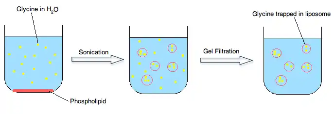 One of the ways liposomes can deliver ions and molecules to the inside of cells is through sonication of phospholipids. Phospholipids are suspended in an aqueous medium and are then sonicated, after which the phospholipids form closed vesicles. Sonication involves applying sound energy to agitate the phospholipids so that they can create liposomes around the desired ions or molecules in the solution. After the liposomes trap the ions present in the aqueous layer, gel filtration is used to wipe out the excess ions. By measuring the rate of efflux of ions from the inner compartment to the outer aqueous solution, the permeability of the bilayer can be measured. The hydrophobic layer of the membrane isolates ions from coming in-as this would be a very thermodynamically unfavorable process. This process is shown in the figure below using glycine as an example.