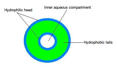 A liposome, or lipid vesicle, is a vesicle enclosed by a lipid bilayer. Lipsomes are the opposite of micelles in that they are hollow on the inside. Liposomes are important for studying membrane permeability and they can be used to deliver ions or molecules inside cells. It is characterized by a bilayer membrane that creates an outer aqueous compartment and an inner aqueous compartment due to the hydrophilic heads and hydrophobic tails of the lipids, as shown by the figure below.