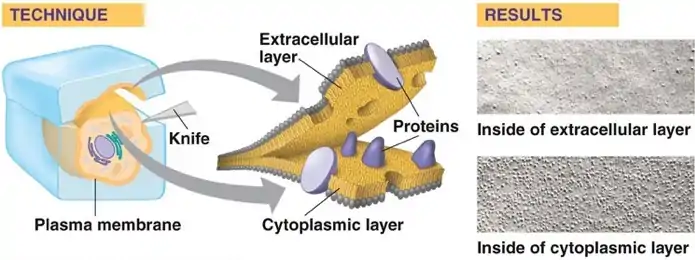 Freeze Fracture (along with metal shadowing and imaging via electron microscopy) is a technique that can be used to visualize membrane structure and protein distribution. First, a cell is rapidly frozen in liquid nitrogen. Then it is cleaved along the fracture plane that splits the lipid bilayer. Separation along this plane exposes the proteins embedded in the membrane. After fracture, the two sections are coated/shadowed with a heavy metal like platinum. Acid is used next to dissolve the organic material, resulting in a replica of the surfaces of the sample. The replicas are then viewed with an electron microscope. The micrographs show bumps on the surface of the sample, which actually are transmembrane proteins since the surfaces of the sample's halves correspond to the inner faces of the phospholipid bilayer. This confirmed that membrane proteins are randomly dispersed throughout the phospholipid bilayer, and that there are integral transmembrane proteins that span the entire membrane.