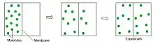 Diffusion is the process by which molecules migrate over the cell membrane from areas of higher concentration to areas of lower concentration. When the amounts of molecules become stabilized, this state is called equilibrium. This occurs through random molecular motion.