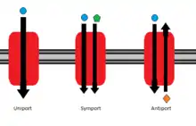 Other carrier proteins can carry more than one molecule across the cell membrane at a time. Symport carriers are carrier proteins that transport two or more different molecules simultaneously across the cell membrane in the same direction. In contrast, antiport carriers are carrier proteins that transport two or more different molecules simultaneously across the cell membrane, of which at least one of the molecules are transported in the opposite direction compared to the others. Generally, these carriers transport at least one molecule down its electrochemical gradient and the other molecules would go against its gradient. The molecules going down the electrochemical gradient will provide the driving potential to push the other molecules against its electrochemical gradient. These types of proteins are classified as secondary transporters, or cotransporters.