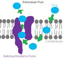MDR stands for Multidrug‐ resistance, and describes large integral protein pumps located in the cell‐surface membranes of most living organisms. The main purpose they serve are to monitor chemicals passing through the cell membrane and eject ones that might endanger the well being of the cell. Normally they are beneficial to the cell's growth, but when growth is unwanted, i.e. in case of a bacterial infection or spreading cancer cells, MDR pumps become a problem. MDR pumps provide the ability to adapt and defend cells against some types of antibiotics. Cells employ the use of MDR pumps for protection against their environments, and researchers need to not only synthesize antibiotics that affect a targeted cell but they need to be able to cross the cell's defenses. The MDR pumps are activated by using packets of energy called ATP to force out unwanted toxins.