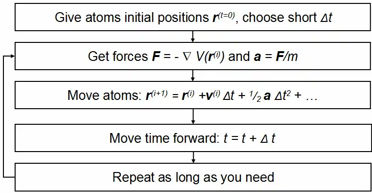 Simulations are conducted in a series of "time steps." In each step, the force on each atom is calculated according to the derivative of the energy equation. The atom is moved a certain distance corresponding to the magnitude and direction of the force over the size of the time step. The process is repeated over many time steps, iteratively calculating forces and solving the equations of motion based on the accelerations from the forces, and produces results that mimic complex behavior from docking of pharmaceutical compounds to the folding of simple proteins.