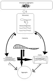 Neurodegenerative diseases are disorders closely linked to old age and affect more than 120 million people world wide per year. Some neurodegenerative diseases were often identified by the misfolding and clumping of their proteins - which led to neurotoxicity.[1] But, this idea has been controversial and in light of recent research, there is a better understanding of the nature of proteins and their effect on neurodegeneracy. A prominent example of this controversial topic is Alzheimer's Disease and the aggregation of peptide β-amyloid (Aβ) in the brain.[2] β-Amyloid peptide can exist as a non-toxic substance in the brain, however, large deposits of this peptide are found in the brains of patients with Alzheimer's Disease. The connection between these degenerative diseases and protein aggregation have been experimentally studied: genetic mutations, increased gene dosage, and post-translational gene modifications. These experiments are associated to Parkinson's Disease, Alzheimer's Disease, and Huntington's Disease, respectively. Despite these experiments, these relationships are still poorly understood. It is commonly thought that neurodegenerative diseases are caused by aging, proteasomal and mitochondrial disfunction, oxidative stress, and abnormal protein-protein interactions via cytotoxicity, a more radical proposition suggests that macroscopic proteinaceous inclusions are also an important factor in the progression of these diseases. These macroscopic inclusions were included in many models for the diseases, but were only recently observed as oligomeric and prefibrillar species in living cells.