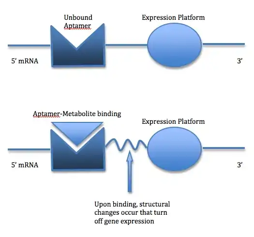 As the mantra of structural biochemistry is that structure determines function, it is not a surprise that the structure of the riboswitch allows for such great function. Most RNA do not need to conform to the strict watson and crick model of DNA allowing for many variations in RNA. The great variation in RNA is responsible for riboswitchs abilities. Riboswitches are made of two parts. the aptamer domain and the expression platform. The aptamer domain essentially acts as a receptor that binds to specific ligands. The expression platform is interesting because it can toggle between two different secondary structures when binding to a ligand, creating a plethora of possible structures. In both parts of a riboswitch there is a switching sequence. This switching sequence directs the expression of the genes. [1]