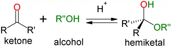 An aldehyde or a ketone can react with an alcohol to yield a hemiacetal or a hemiketal.Hemiacetals and hemiketals are compounds that are derived from aldehydes and ketones respectively. The Greek word hèmi means half. These compounds are formed by formal addition of an alcohol to the carbonyl group. When the alcohol group is replaced by a second alkoxy group, an acetal or a ketal, respectively, is formed. For example, the acetal formation ends with having two ethers on the target carbon, whereas the hemiacetal and hemiketal has both an alcohol and ether group.