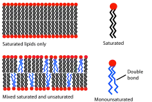 The length of the lipids also plays a role. Lipids move in two distinct ways. Most commonly they interact in lateral diffusion where they switch places with the lipid to the left or right of them. Other times, they go through transverse diffusion where they flip flop with the ones whose tails they are facing. This is due to the weak, Van der Waals interaction of the lipid molecules. The longer the lipid is, the stronger this interaction is, therefore decreasing the mobility of the lipids. Decrease lipid mobility yields in decreasing the fluidity of the membrane.