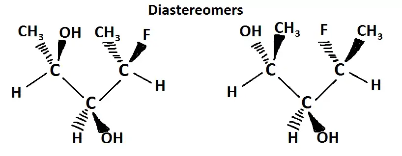 There are 3 stereocenters in the molecule below. The atoms have been switched in the first and third carbon. This is an example of diastereomers. If the second carbons atoms were switched also, then these two molecules would be enantiomers.