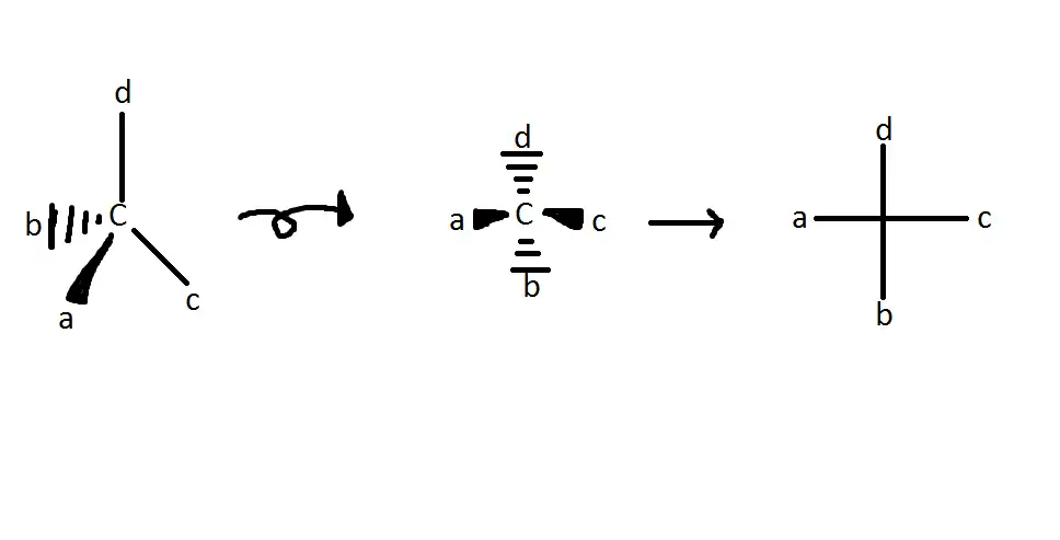 In Fischer projections, bonds attaching substituents to the central carbon are shown using horizontal and vertical lines. Similar to the hashed-wedged line structures, horizontal lines are indicative of bonds coming towards the viewer, while vertical lines indicate bonds going away from the viewer. It is a simplified way of showing tetrahedral carbon atoms and their substituents in 2 dimensions. Converting hashed-wedged structures to Fischer projections is a simple process. Here is an example shown below.