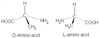 The stereochemistry of amino acids are represented with an L,D system. The L,D system is essentially the same as the R,S system for absolute configuration with the exception that the L,D system is for amino acids. For the L,D system, L is the equivalent of the S absolute configuration leaving D to be the equivalent of the R absolute configuration.