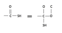 Rule 4: Double and triple bonds can be viewed as if they were single bonds, but with the extra bonds added to each end of the multiple bond as single bonds. This can be seen on the figure to the right. The carbon is attached to a thiol group and is double bonded to an oxygen. This double bond can be seen as the carbon attached to two single bonded oxygens, and the second oxygen is bonded a carbon (representing the double bond to the initial carbon).