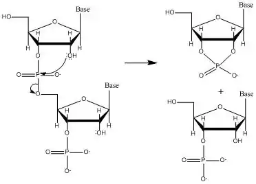 For the nucleotides to form RNA, they must be activated themselves (meaning that they must be combined with two more phosphate groups, as in adenosine triphosphate). Activated purine nucleotides form small chains on a pre-existing template of all-pyrimidine RNA. However, this does not happen in reverse because the pyrimidine nucleotides do not stack well.