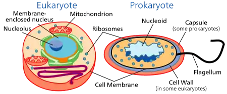 Out of the two prokaryotic cells are considerably simpler than eukaryotic cells. Bacteria and archaea are considered prokaryotes. Prokaryotic comes from the Greek prefix pro which means before and the Greek root karyon which means kernel. They tend to be smaller in size and are not as complex as eukaryotic cells. As their names suggests, prokaryotic cells lack any organelles enclosed with a membrane. Their DNA is in an area called the nucleoid which also is not enclosed by a membrane. The nucleoid is not separated from the cytoplasm. Generally speaking, their chromosomes and plasmids are circular and naked, they have no nuclear envelope. In addition, prokaryotic cells control genes via operons. But, like eukaryotic cells, they have a plasma membrane surrounded by a cell wall. However, their cell wall contains petidoglycans which can't be found in Eukaryotic cells.[1]