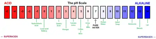 The scale is broken up into two regions: acidic (pH 0-7) and basic (pH 7-14) with a pH of 7 being said to be "neutral." Some acidic substances are gastric acid (pH ~ 2), vinegar (pH ~ 3) and coffee (pH ~ 5). Some basic substances are hand soap (pH ~ 10), ammonia (pH ~ 13), and lye (pH ~ 14). An example of a "neutral" substance would be pure water (pH ~ 7). pH values below 0 require measurements using specialized equipment. The reason is that typical pH measurements are done in an aqueous solution, which means that the measured pH will only be as strong as the weakest acid in solution (in this case H3O+ which has a pKa of 0). Therefore, measurements are typically made by calibrating with a strong acid like sulfuric acid. Similar arguments also apply for extremely strong bases.