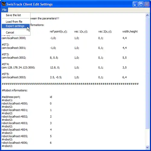 The proper syntax of the SwisTrack Multi-Camera Client settings is (with example)):