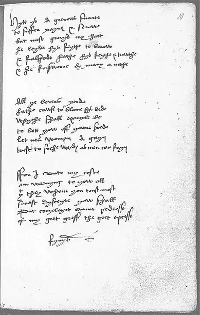 H2 paid particular attention to the presentation of this poem: it begins on the verso of f.9 and continues on the recto of f.10 (facing pages). The stanzas are evenly spaced for the maximum visual effect of balance. "Farewell all my wellfare" is one of seventeen entries in which Margaret Douglas marks: “and thys.” Paul Remley suggests that these annotations relate to another in-text annotation of hers, “lerne but to syng it” (81r), and may indicate a group of texts to be learned for entertaining.[4]