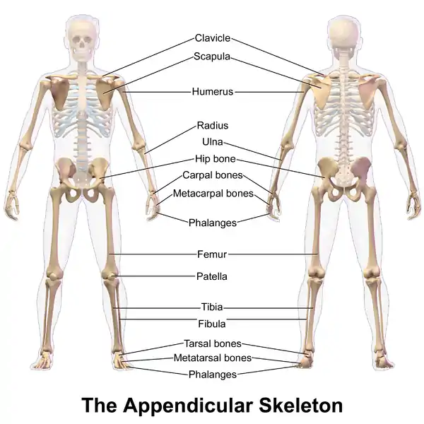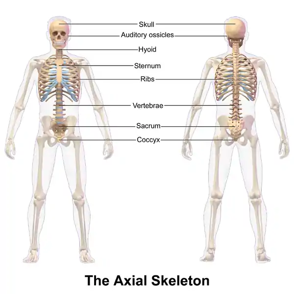 There are 206 bones in the human body. The Axial skeleton includes the skull, which protects the brain from damage and the spine, or the vertebral column, which keeps the spinal cord protected and allows for major torso movements. The Appendicular skeleton hangs off of the axial skeleton and includes the limbs (i.e. arms, legs, hands, and feet, etc.)
