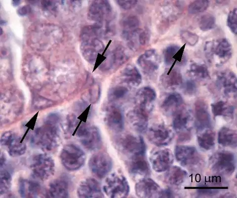 Sertoli cells [arrows] are characterized by their irregular shaped nuclei. These cells are found at the luminal side of the basement membrane of the spermatogenic tubules. They occur either solitairy, or in close association with the spermatogenic cysts, which they enclose; in this condition they are also known as lobule boundary cells. |